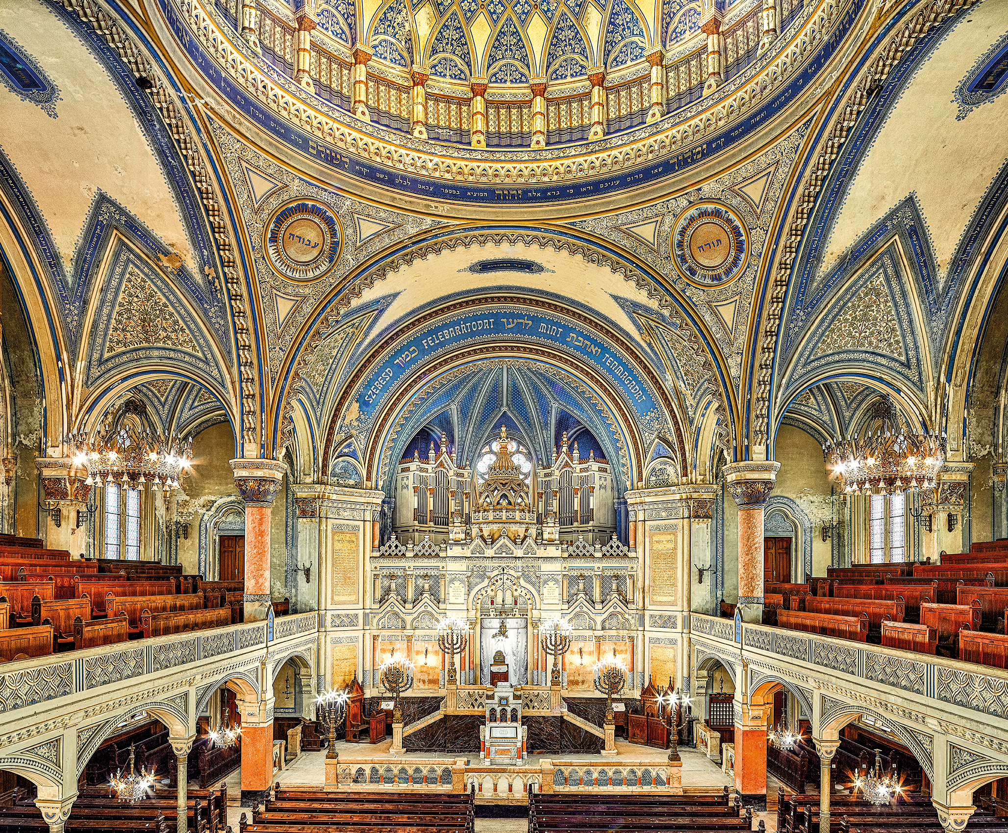De la somptueuse Grande Synagogue de Budapest aux flamboyantes synagogues de Venise, des jumelles élégantes de Londres et Amsterdam à l’imposante Victoire de Paris, des sanctuaires presque invisibles d’Italie aux reflets dorés de la Spanish Synagogue de Prague, faisant écho à son alter ego de New York, sans oublier les chefs-d’œuvre oubliés de Roumanie : chaque pierre, chaque ornement, chaque vitrail raconte une épopée de foi, d’exil et de renaissance.